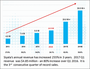 Seit 2013 ist der Umsatz von 4,9 Mio. US$ auf 12,5 Mio. US$ in 2016 nahezu explodiert. Und so soll es auch weitergehen: Für das aktuelle Jahr erwartet Siyata einen Umsatz von über 20 Mio. US$ - 2018 sollen sogar über 30 Mio. US$ erwirtschaftet werden. Dies entspricht mehr als einer Umsatzverdopplung von 2016 aus. Sollten diese Pläne in die Tat umgesetzt werden, dürfte sich dies zweifelsohne auch auf den Aktienkurs sehr positiv auswirken.