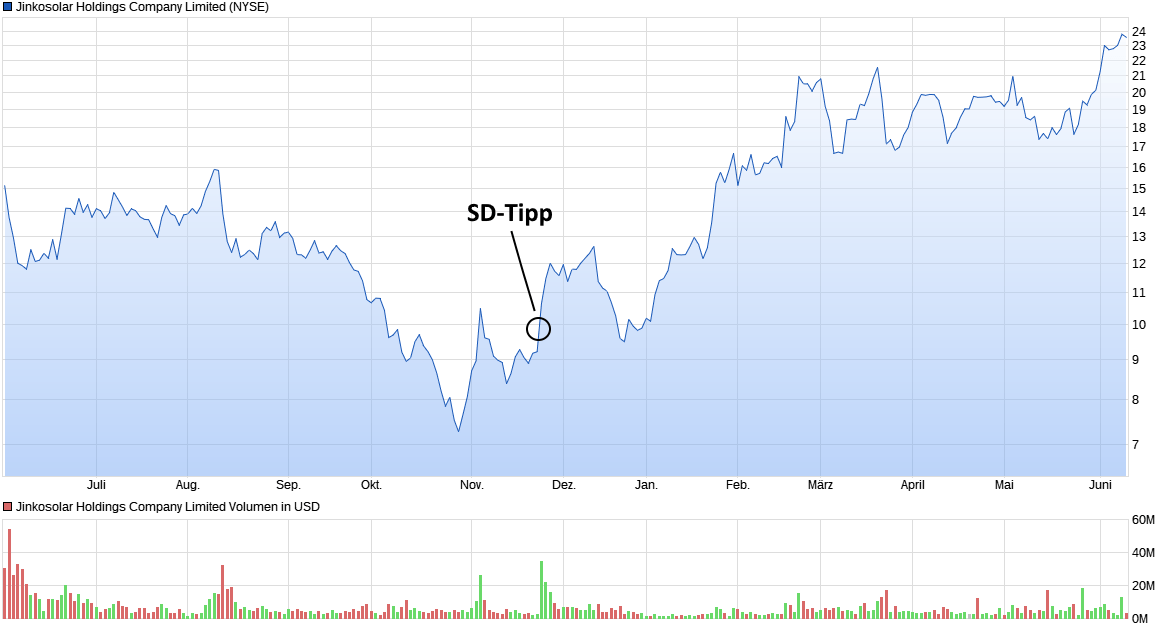 SD-Leser, die zu unserem Tipp im November Jinko-Aktien kauften, liegen komfortable +140% vorn. Am Tag unseres Tipps erreichte das Papier 9,81 US-Dollar. Seitdem zieht der Kurs nach oben und schloss gestern auf 23,57 US-Dollar.