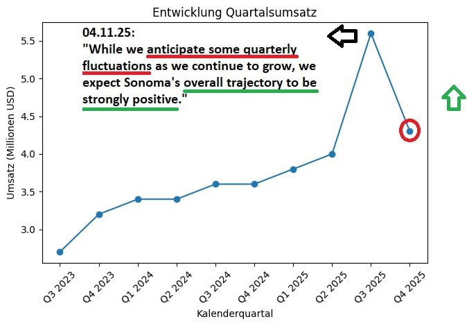 Sonoma arbeitet neben seinem Umsatzwachstum auch kontinuerlich an höheren Margen. Im zweiten Halbjahr des Kalenderjahres 2025 lag der EBITDA-Verlust bei nur noch 0,8 Millionen US-Dollar; im Vorjahr hatte er noch doppelt so hoch gelegen. Da Sonomas Fiskaljahr im März endet, wird die nächste Finanzberichterstattung im Juni erwartet.