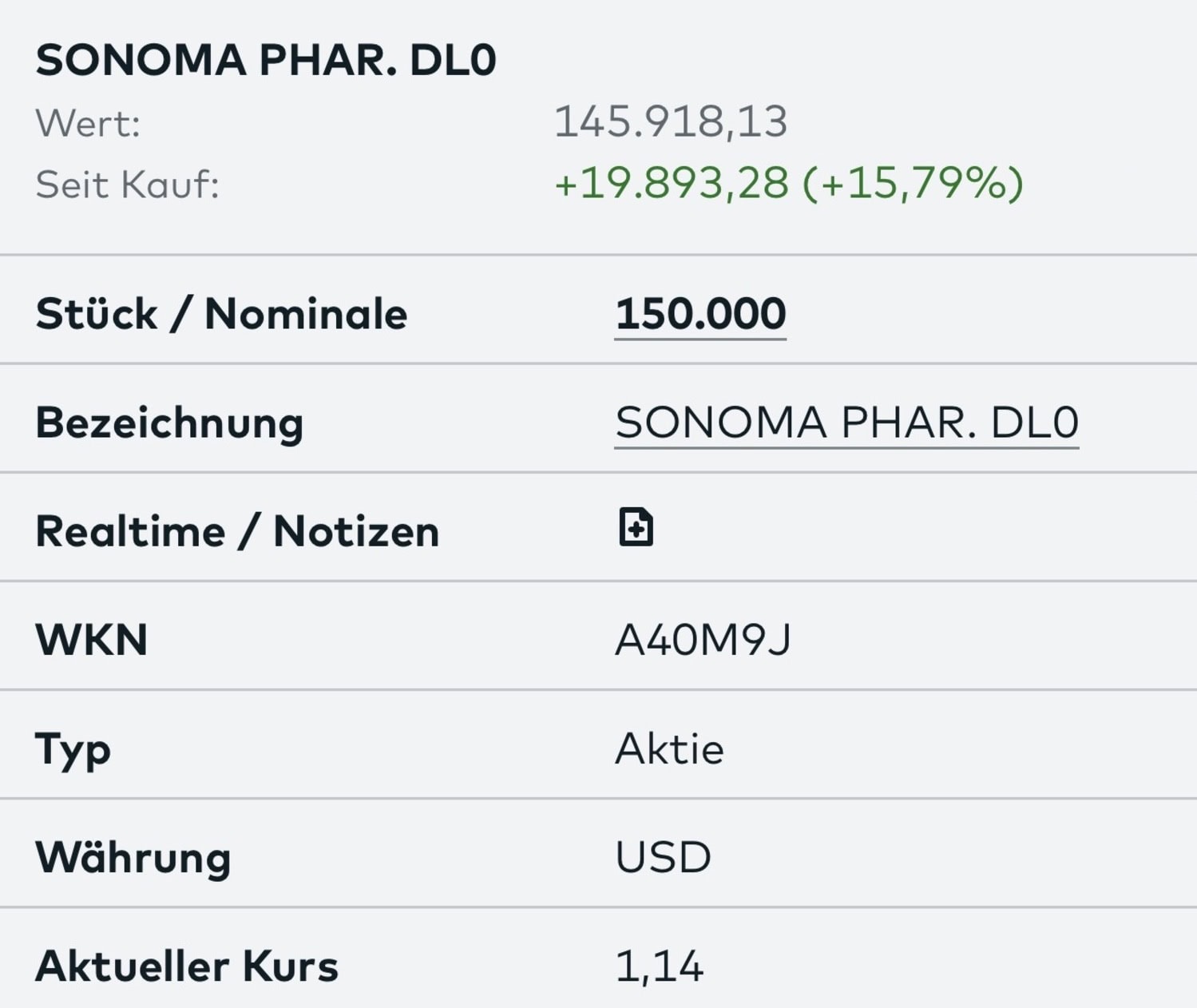 Nachdem die Katze aus dem Sack war, versprach die Sonoma-Aktie für mich sichere Prozente: In einem ersten Schritt erwarb ich 150.000 Anteile mit einem Einstiegskurs von im Schnitt rund 0,98 US$. Ich könnte mir vorstellen, diese Position weiter auszubauen und nach dem heute erwarteten Abschluss der Kapitalerhöhung zu einem 5%-Aktionär des Unternehmens aufzusteigen. Dabei bleibe ich derzeit tendenziell unterhalb der 1-US$-Marke Käufer und darüber Verkäufer.