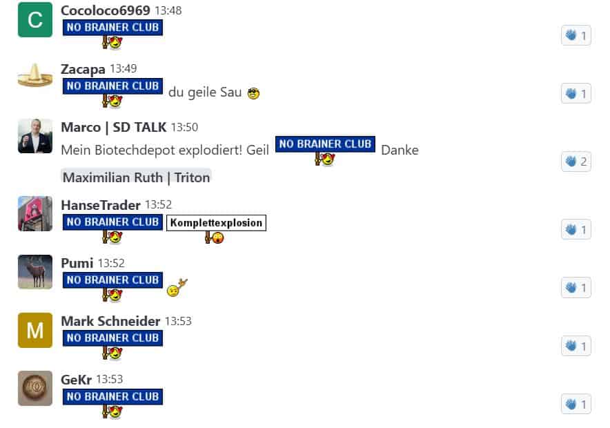 Im Anlegerkreis No Brainer Club (NBC) kennt der Jubel angesichts der Kursexplosion kein Halten mehr, wie der obige Screenshot beweist. NBC-Chefanalyst Maximilian Ruth und sein Team hatten den Titel nachhaltig und mit einer hohen Gewichtung im Depot empfohlen. Fairerweise muss man an dieser Stelle hinzufügen, dass Geduld erforderlich war, bis es jetzt endlich knallt.
