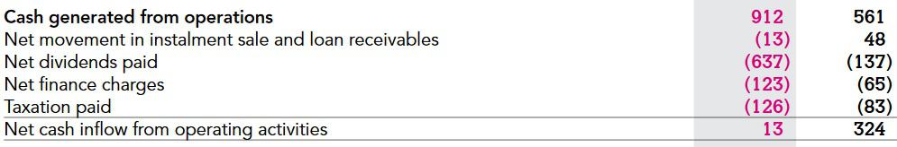 In den Medien ist zu lesen, dass der so wichtige positive Netto-Cashflow des Konzerns in den ersten sechs Monaten des jüngsten Fiskaljahres auf nur noch 13 Millionen Euro zusammengeschrumpft sei. Das ist zwar korrekt, jedoch ist diese Angabe mehr als irreführend, da ein Großteil der Erträge als Dividende ausgeschüttet wurden - viel mehr als im Vergleichszeitraum des Vorjahres, wie folgender Bilanzauszug belegt: