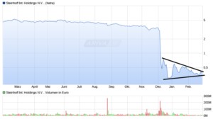 Charttechnisch steht bei Steinhoff die Entscheidung bevor. Aus der jeweils dominierenden Abwärts- und Aufwärtstrendgerade seit Krisenbeginn im Dezember bildet sich aktuell im Chart ein Dreieck. Erfahrungsgemäß gilt eine signifikante Bewegung über bzw. unter die Dreieckslinien als Trendforsetzungssignal. Eventuell fällt die Entscheidung ja mit der Veröffentlichung des PwC-Reports zusammen?