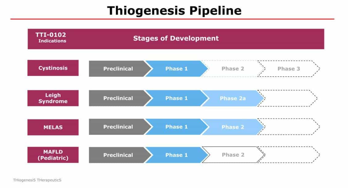 Welche Bedeutung das neue Asset hat – das quasi zum Nulltarif bei den klinischen Forschungen des MELAS-Trials entdeckt wurde – zeigt die neue Pipeline auf, die Thiogenesis nun veröffentlicht hat. Dort rückt die neue Zystinose-Studie gleich ganz nach oben an die erste Stelle.
