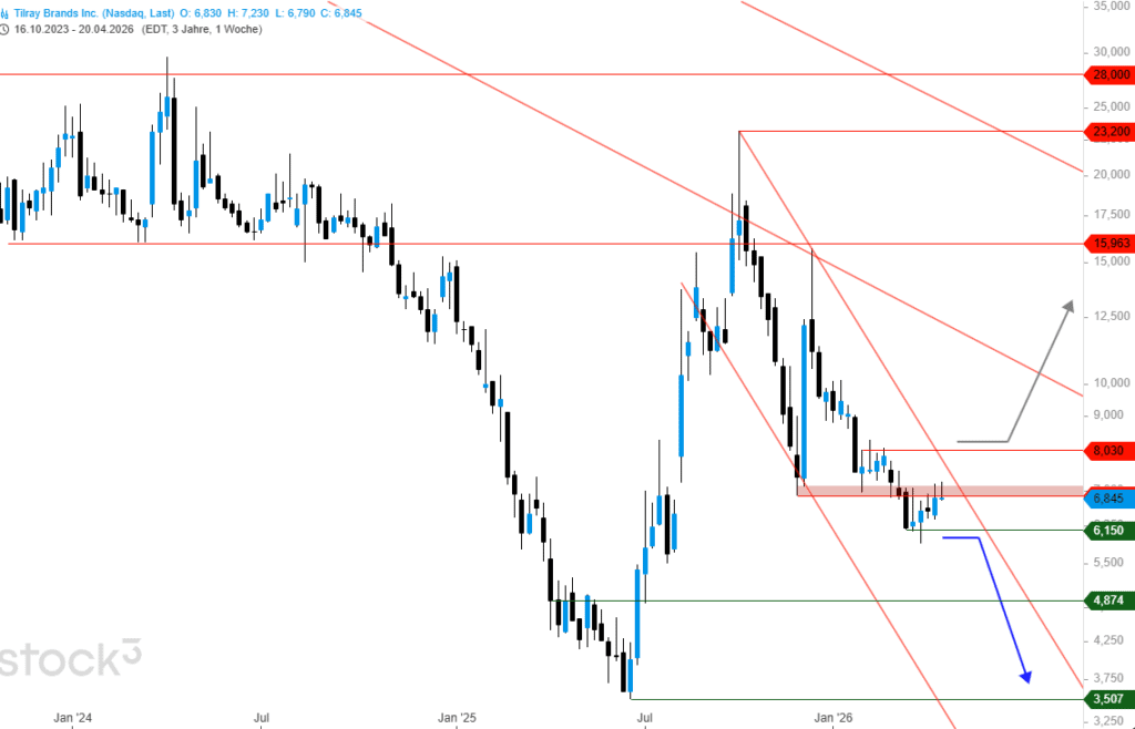 Hierbei spielt die Marke von 6,15 US$ eine entscheidende Rolle, da sich der Kurs von Tilray Brands bisher via Wochenschlusspreis stets darüber halten konnte. Aktuell gibt die Aktie ihre jüngsten Reaktionshochs wieder ab und könnte dadurch in Kürze wieder an diesem Level ankommen.