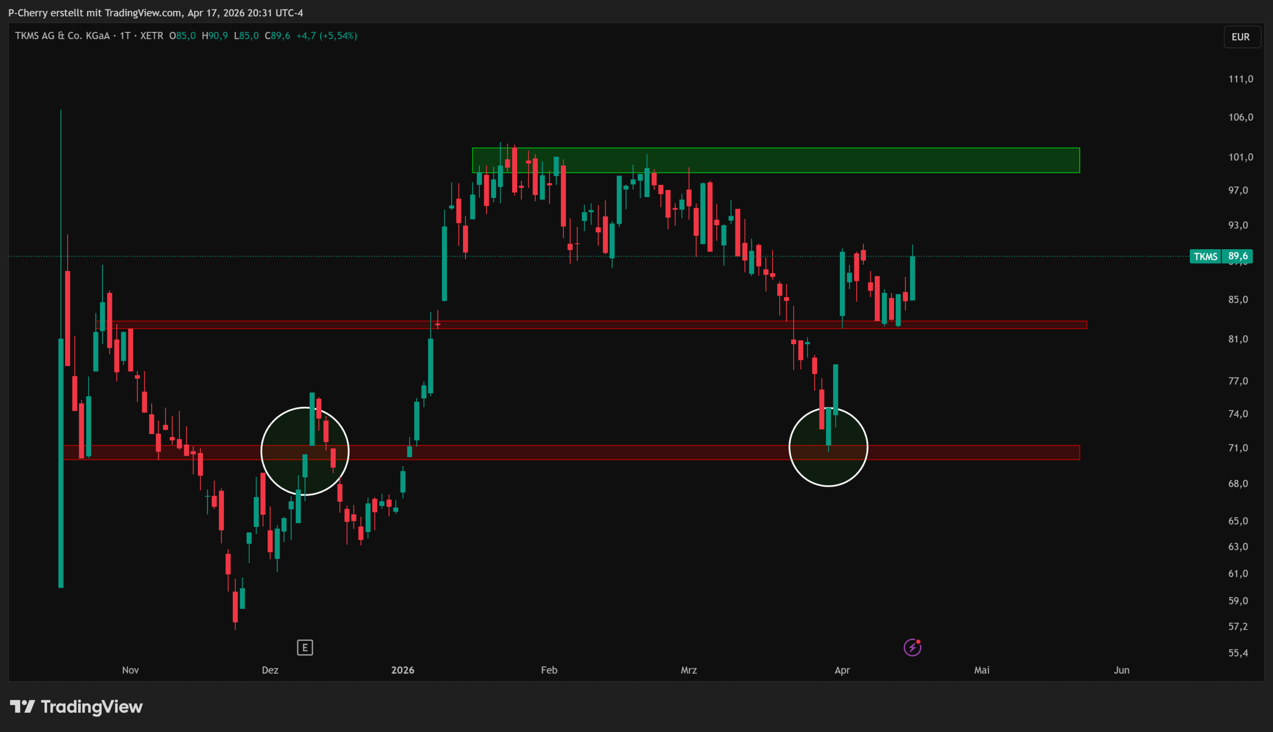 Vom lokalen Hoch am 22. Januar 2026 verlor der Kurs der TKMS-Aktie rund -31% und fand Halt im Unterstützungsbereich. Dabei hat der Kurs der Aktie gleichzeitig eine Kurslücke, welche zwischen 70,50 € und 71,15 € lag, geschlossen. Anschließend drehte der Kurs um und stieg mittlerweile über +29% an.