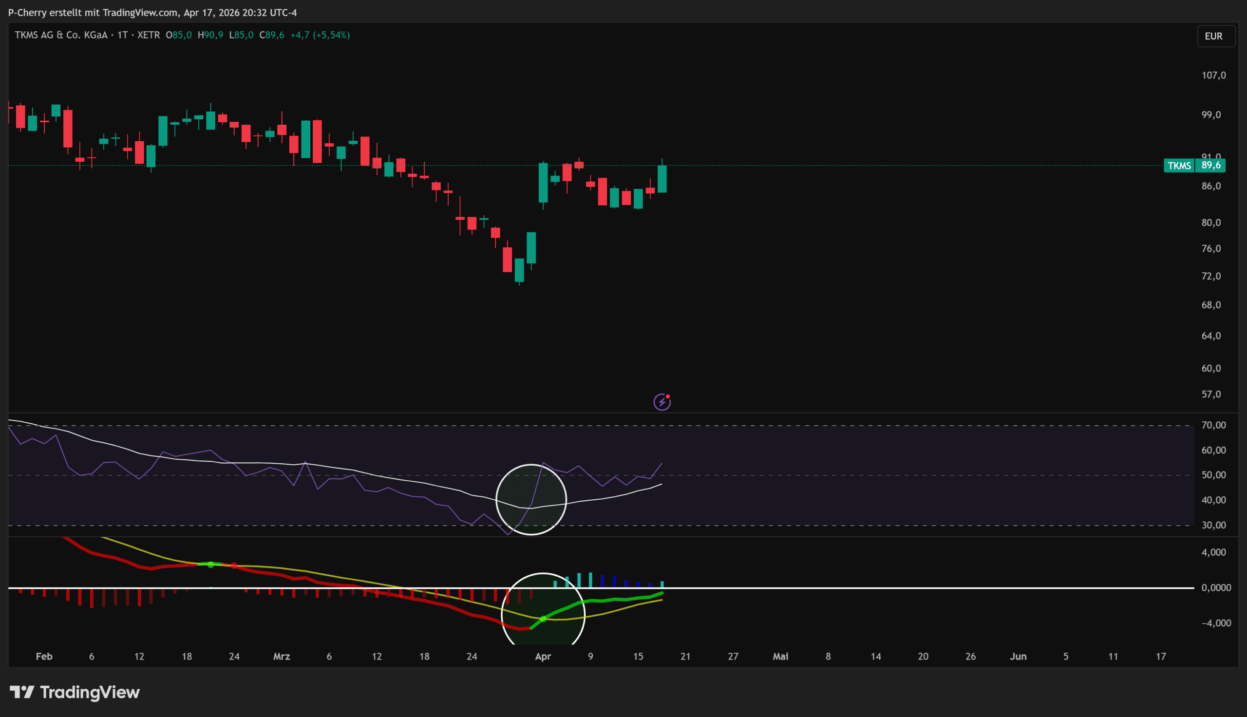 Die TKMS-Aktie zeigt nach dem starken Rebound von knapp +30% vom Tief wieder klare Stabilisierungstendenzen. RSI und MACD liefern bullische Signale, das Momentum bleibt jedoch noch vergleichsweise verhalten.