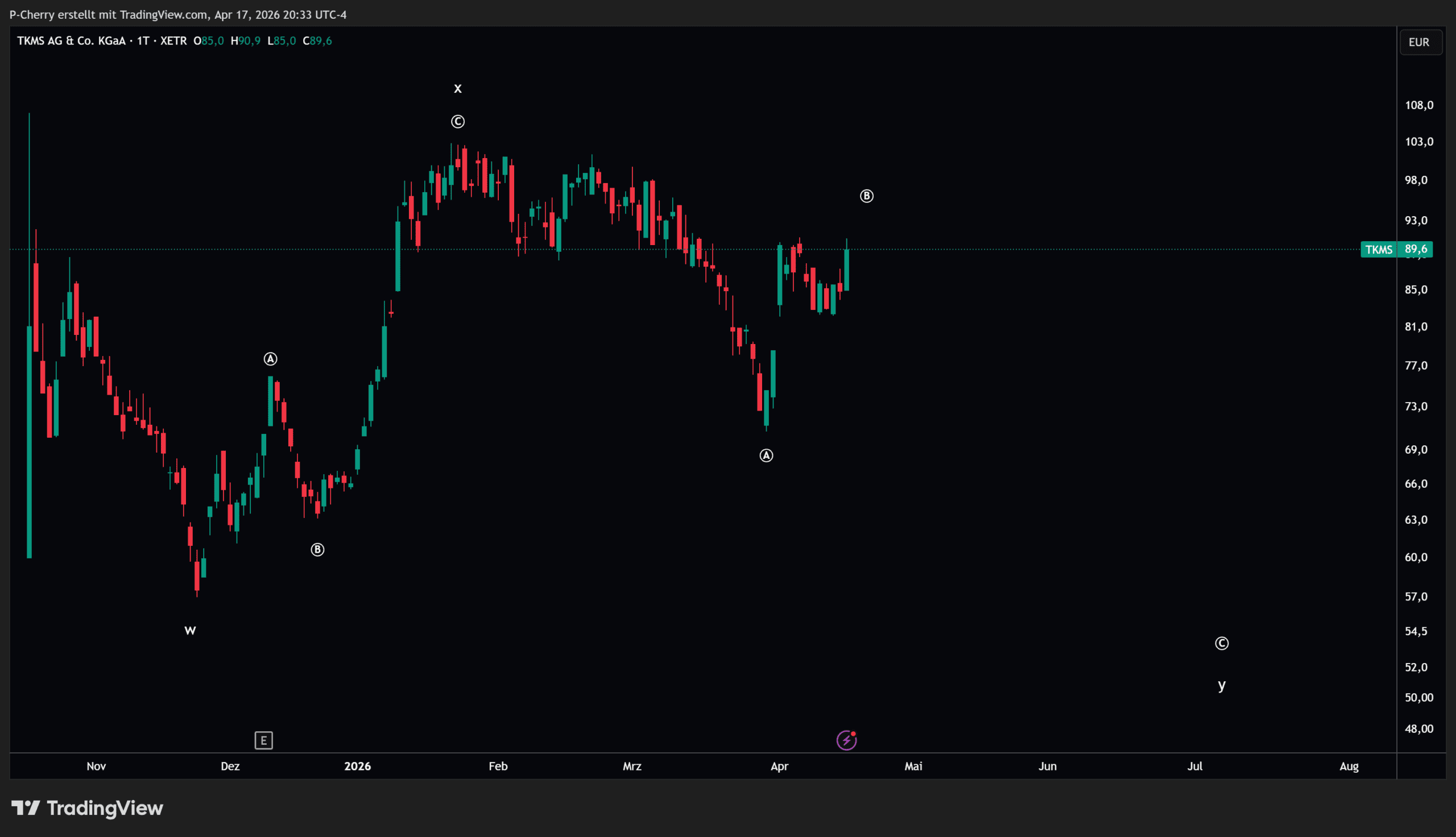 In der Primärerwartung ist mit einem neuen Allzeittief zu rechnen, nach Abschluss der B-Welle in Form einer Welle C, welche die übergeordnete Y-Welle komplementieren könnte. Möglich ist hingegen auch, dass sich der Kurs der TKMS-Aktie in einer korrektiven Aufwärtsstruktur befindet, als führende Diagonale. Ein Durchbruch über die X-Welle würde die Wahrscheinlichkeiten für dieses Szenario deutlich anheben.