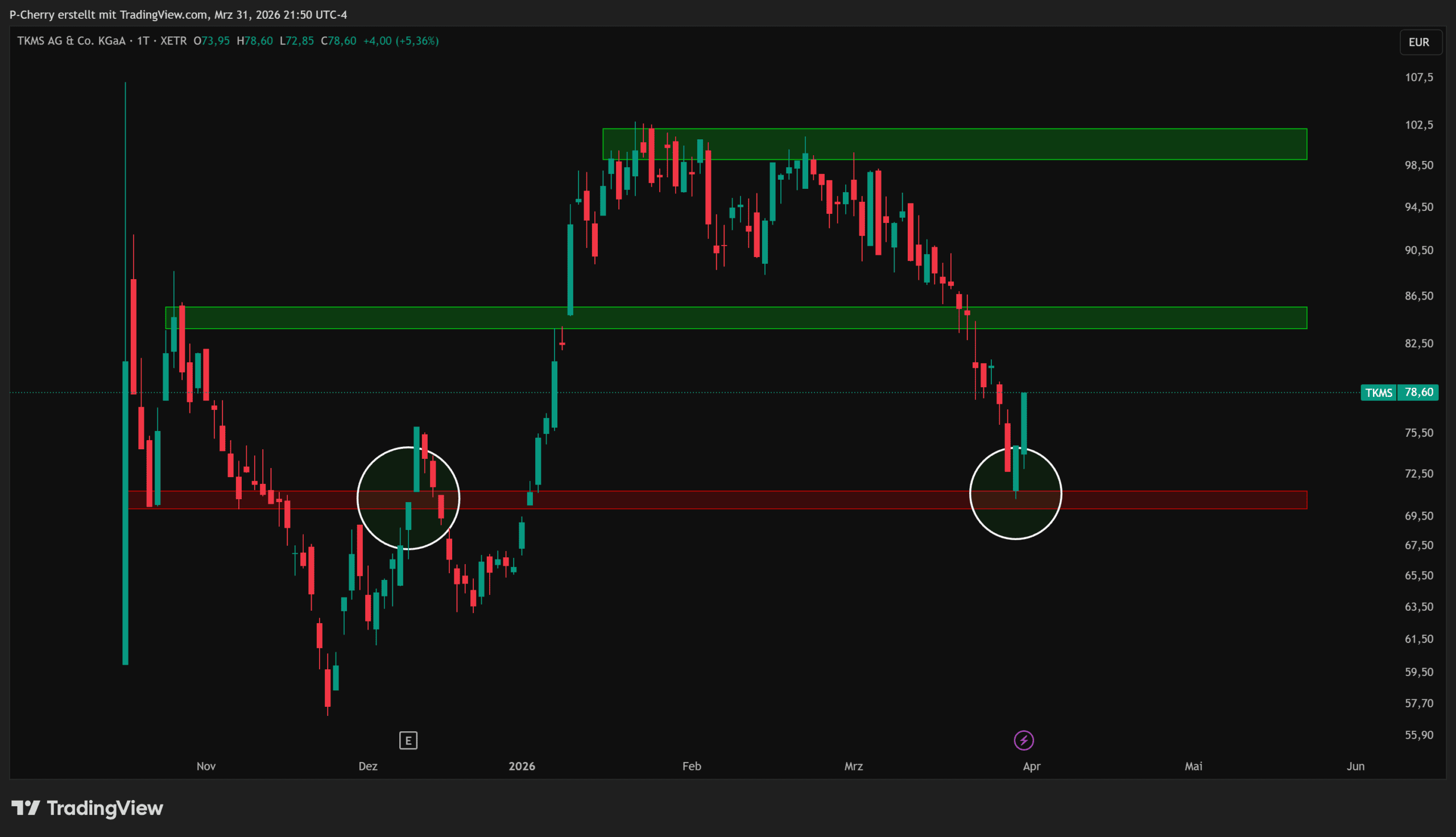 Vom lokalen Hoch am 22. Januar 2026 verlor der Kurs der TKMS-Aktie rund -31% und fand Halt im Unterstützungsbereich. Dabei hat der Kurs der Aktie gleichzeitig eine Kurslücke, welche zwischen 70,50 € und 71,15 € lag, geschlossen. Anschließend drehte der Kurs um und stieg +11% an.
