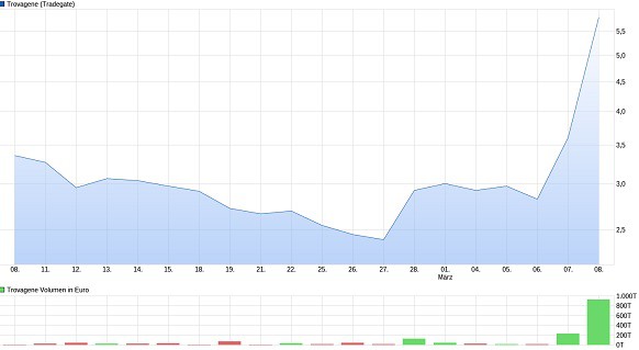Allein seit unserer neuen Empfehlung gab es einen Kursgewinn von zwischenzeitlich über +200% zu verzeichnen. NBC-Mitglieder können nun auch bei Trovagene entspannte Gewinne mitnehmen und einen kleineren Einsatz im Spiel halten, um auf noch mehr Kursspektakel zu setzen.