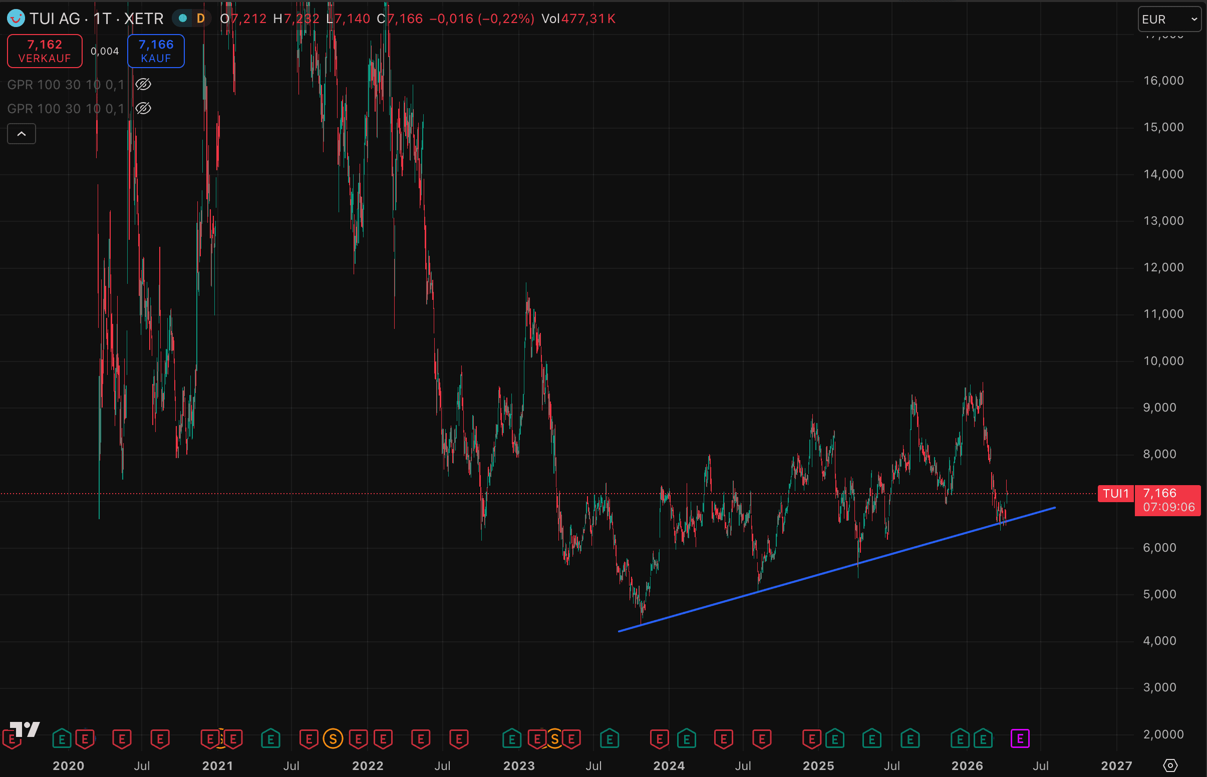 Die TUI-Aktie notiert aktuell bei rund 7,16 € und damit deutlich unter früheren Höchstständen. Dennoch zeigt sich im übergeordneten Bild eine interessante Entwicklung. Seit Oktober 2023 befindet sich der Kurs in einer Art Aufwärtskonsolidierung mit tendenziell höheren Hochs. Genau das macht die aktuelle Situation spannend, da sich daraus weiteres Potenzial ergeben könnte. Gleichzeitig bleibt das Umfeld entscheidend. Trotz zwischenzeitlicher Erholung ist die Unsicherheit im Markt weiterhin präsent, was sich auch im Kursverlauf widerspiegelt.