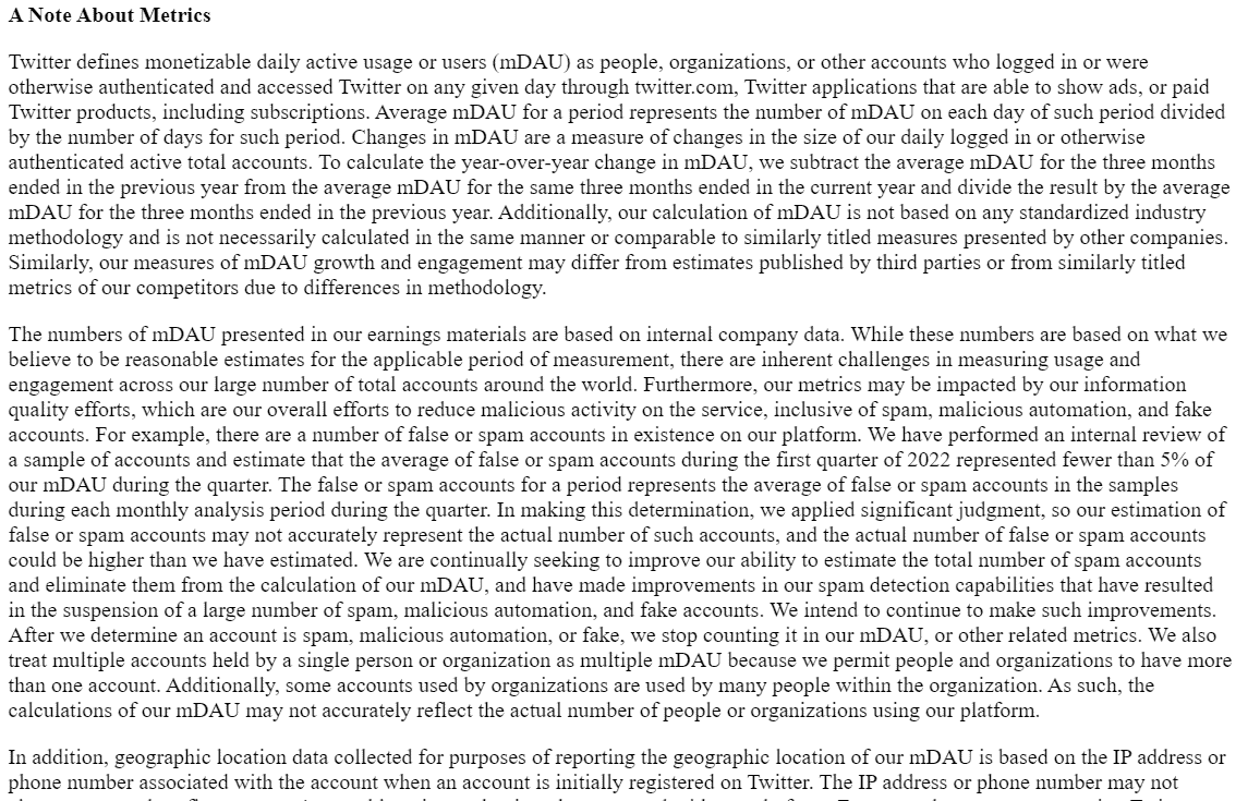 Denn Twitter behauptet nicht, dass weniger als 5% der aktiven Nutzer Bots sind. Twitter schätzt(!) nach einem komplexen internen Verfahren, dass weniger als 5% der aktiven Nutzer automatisiert sind. Solange das Verfahren von Twitter nicht wissentlich manipuliert wird, ist es schwierig, hier eine sogenannte „Misrepresentation" nachzuweisen. Du musst es nicht in Gänze lesen, aber nur um ein Gefühl zu bekommen, wie lange und ausführlich der Disclaimer von Twitter zur Messung der Bots ist: