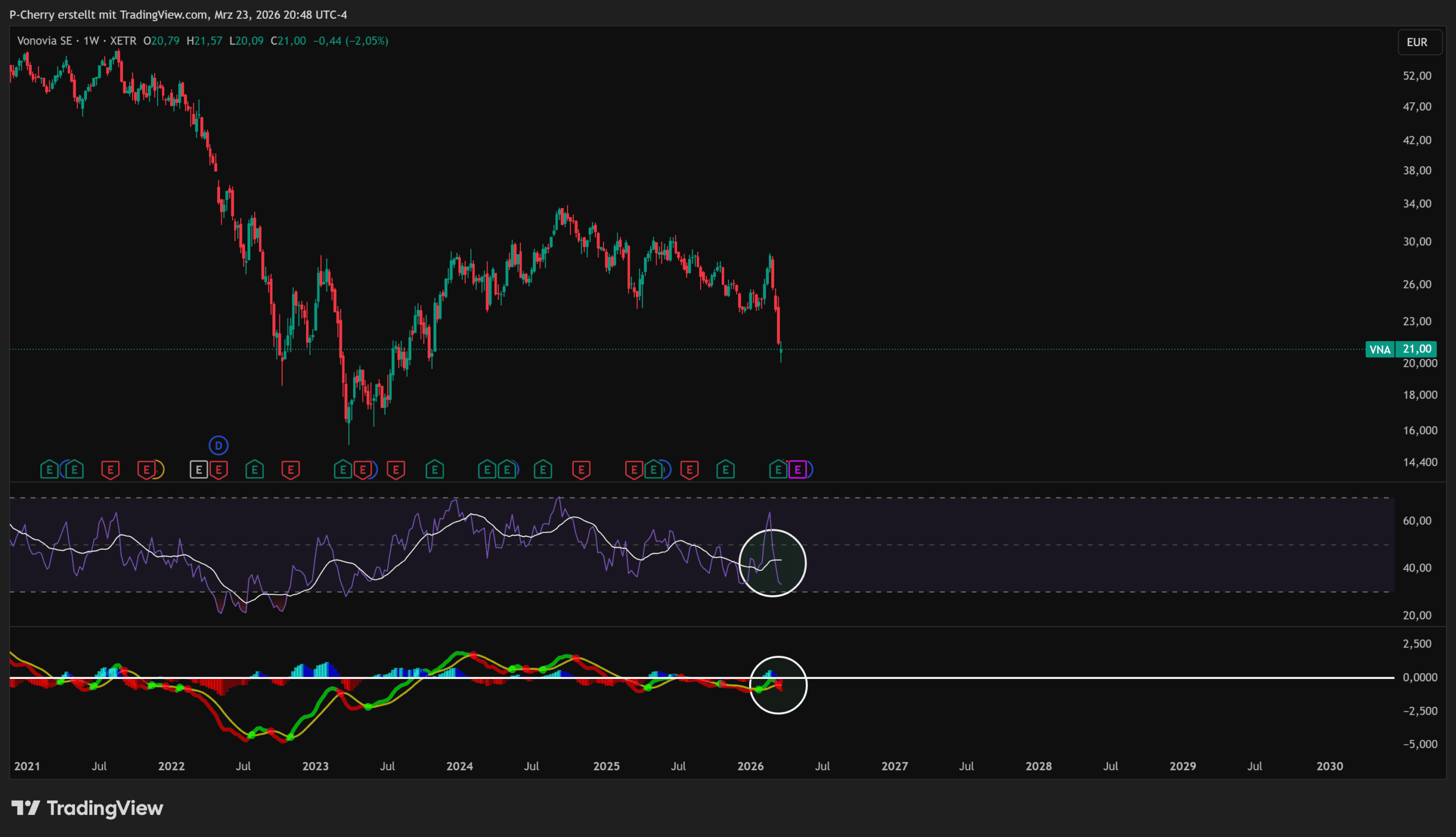 Besonders kritisch ist die aktuelle Situation der Vonovia-Aktie, da der Kurs in den letzten 3 Wochen um -31% zurück in den Unterstützungsbereich gefallen war. Diese Zone hat bereits mehrfach als wichtige Haltezone fungiert und entscheidet jetzt über den weiteren Verlauf.