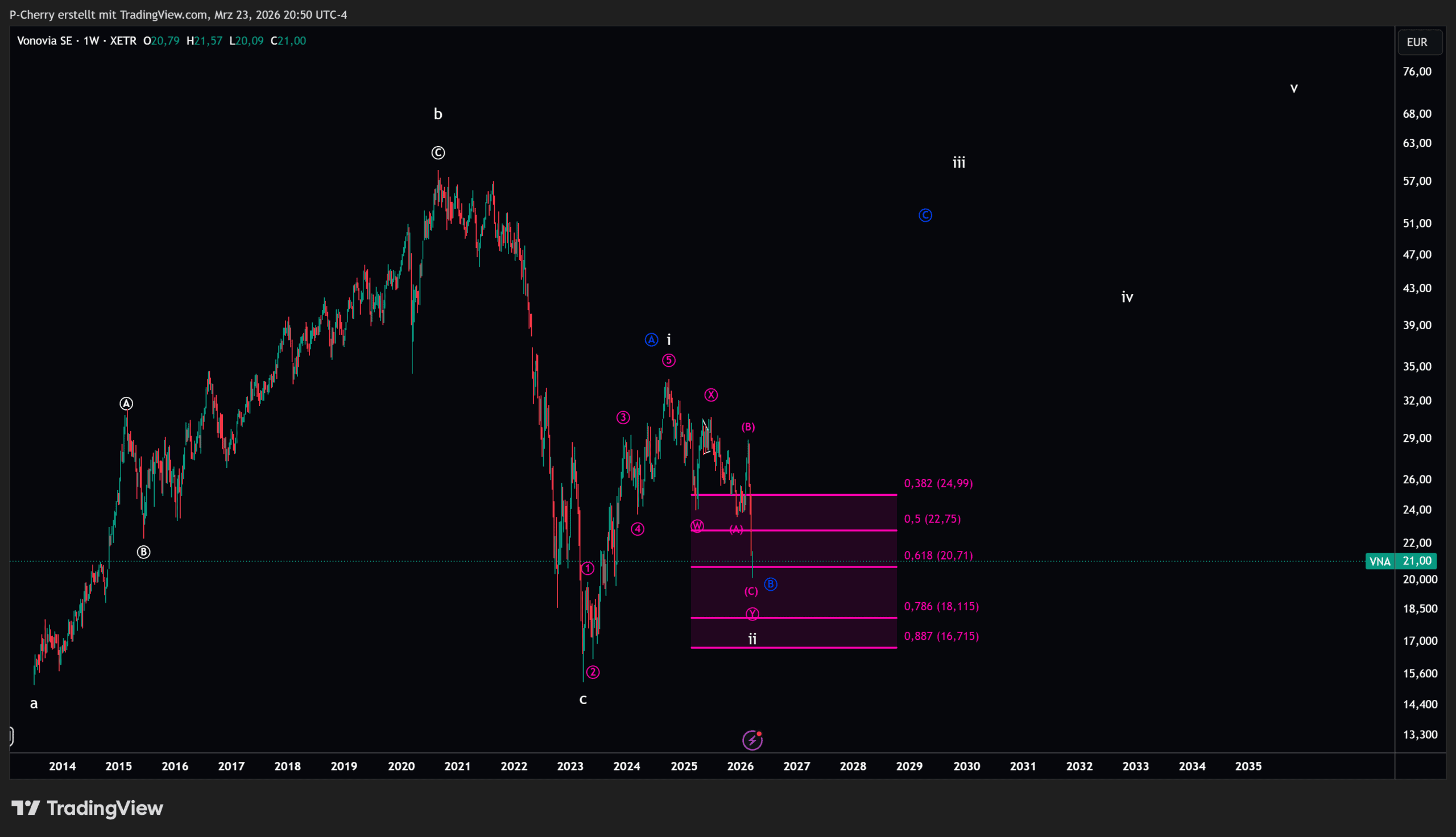 Im Wochenchart der Vonovia-Aktie zeigt sich eine große ABC-Struktur, welche mit dem Hoch im August 2020 bei 58,76 € ihren Abschluss in einer Welle B fand. Danach folgte die Welle C bis zum Tief bei 15,27 € im März 2023.