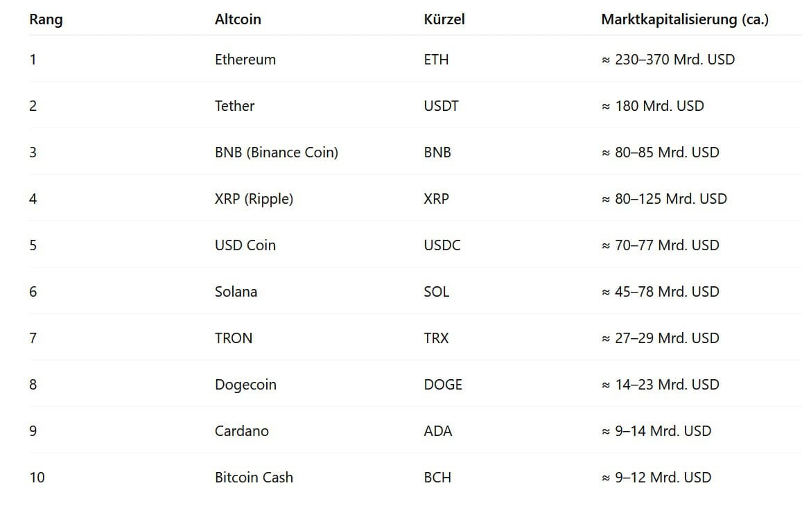 Die folgende Tabelle zeigt eine Übersicht der zehn wichtigsten Altcoins der Welt, gemessen an ihrer Marktkapitalisierung (Stand März 2026):