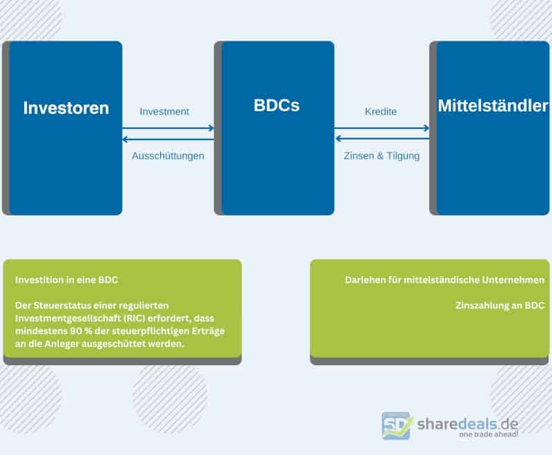 - Business Development Companies (BDCs) vergeben meist besicherte Kredite an kleine und mittlere Unternehmen. Über börsennotierte BDC-Aktien können Privatanleger in diese sonst schwer zugängliche Anlageklasse investieren.