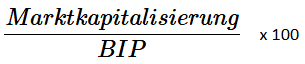 Der Buffett-Indikator fasst die Marktkapitalisierung aller börsengelisteten Aktien eines Landes zusammen und setzt diese ins Verhältnis zum aktuellen Bruttoinlandsprodukt (BIP). Dazu teilt man die Marktkapitalisierung durch das BIP und multipliziert das Resultat mit 100. In einer Formel ausgedrückt, entsteht eine klassische Bruchrechnung: