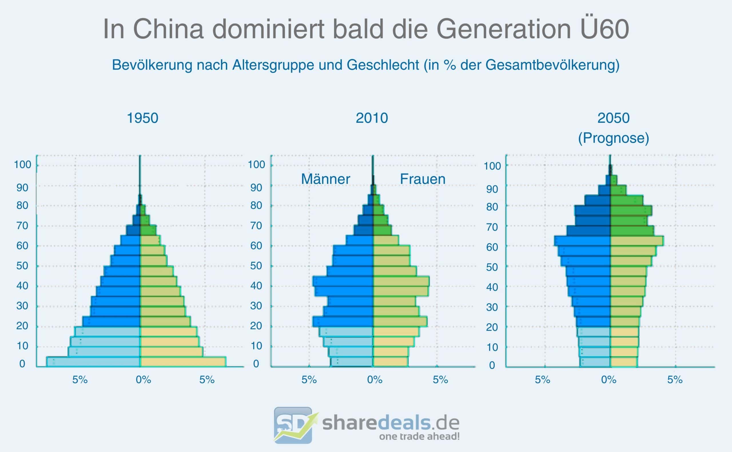 Erstens sinken die Geburtenraten, wodurch immer weniger junge Menschen nachrücken. Zweitens steigt die Lebenserwartung stetig, was die Zahl der Rentner nach oben schiebt. Und drittens rollt die Pensionierungswelle der Babyboomer unaufhaltsam bis etwa 2050 durch die Industriestaaten. Das alles passiert keineswegs gleichmäßig auf dem Globus: In China etwa wird sich der Anteil der über 65-Jährigen bis 2040 mehr als verdoppeln, während die Jüngeren rapide weniger werden.