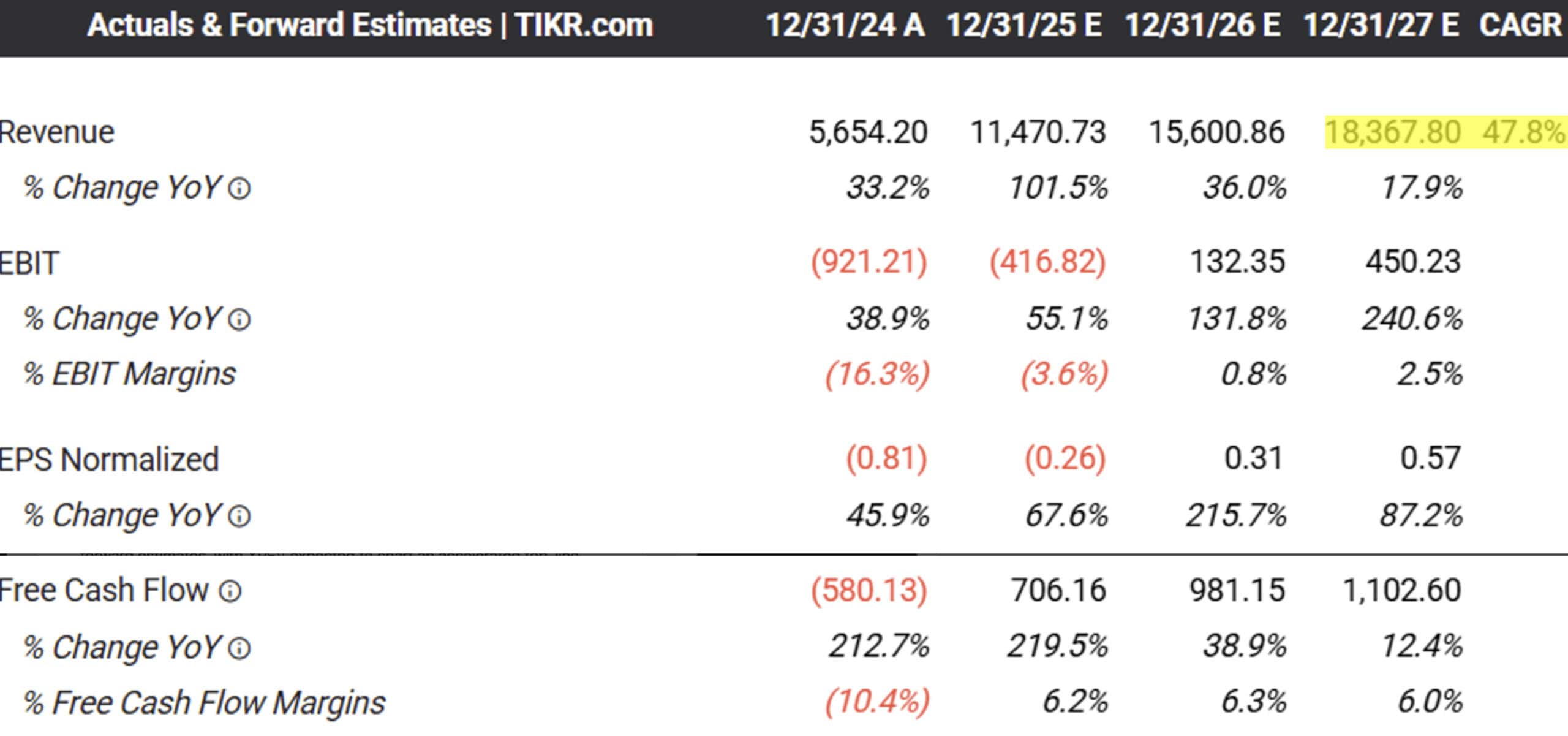 Trotz Kursrückgang um 32% seit März 2025 notiert die Aktie beim 1,31-fachen des für 2025 erwarteten Umsatzes – das ist über dem Branchenschnitt von 1,25. Blickt man auf 2027 und den entsprechenden Analystenkonsens, sinkt das Verhältnis auf 0,80 bei erwarteten Erlösen von über 18 Mrd. US$ und einer durchschnittlichen jährlichen Wachstumsrate (CAGR) von 47,8%.