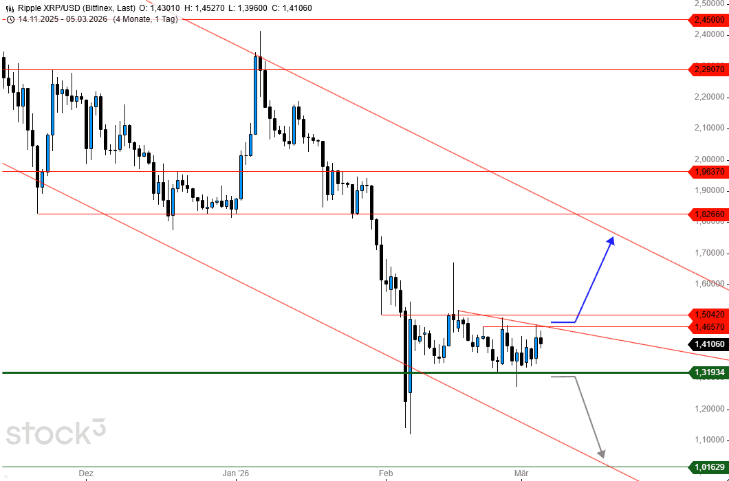 Die bereits im Februar begonnene Stabilisierung setzt sich seither weiter fort und so tendiert der Preis von Ripple in einer Range von 1,32 bis 1,50 US$. Wobei sich die obere Range-Kante beziehungsweise ein neuer Widerstandsbereich etwas nach unten verschoben hat. Dieser lässt sich bei 1,47 US$ lokalisieren und stellt das neue Trigger-Level auf der Oberseite dar.