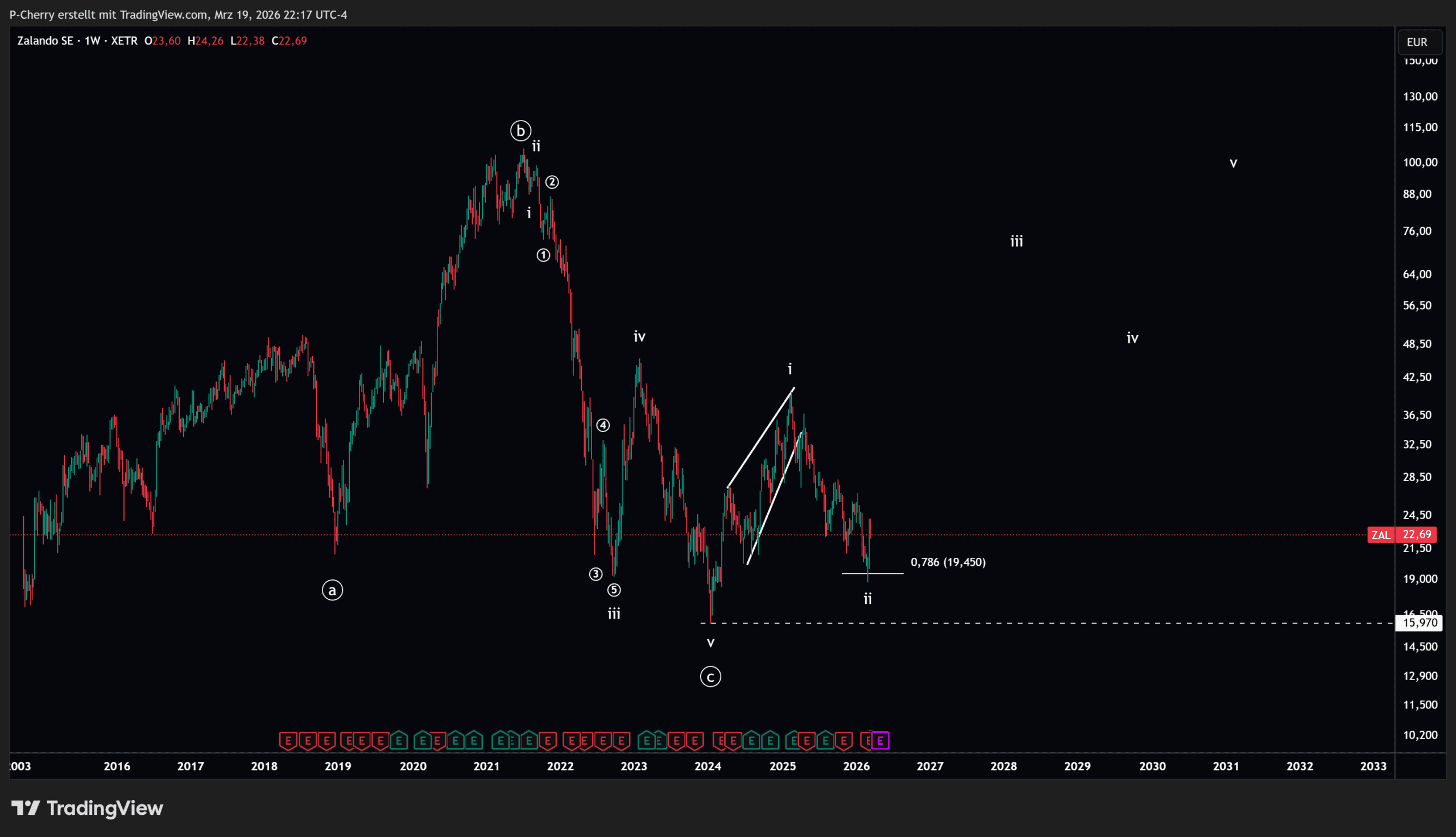 Im Wochenchart der Zalando-Aktie zeigte sich ein übergeordneter Abwärtstrend im Rahmen einer klar strukturierten Elliott-Wellen-Bewegung. Nach der abgeschlossenen Abwärtsbewegung bis zur Welle (v) im Januar 2024 startete der Kurs der Zalando-Aktie einen neuen, bullischen Aufwärtstrend.